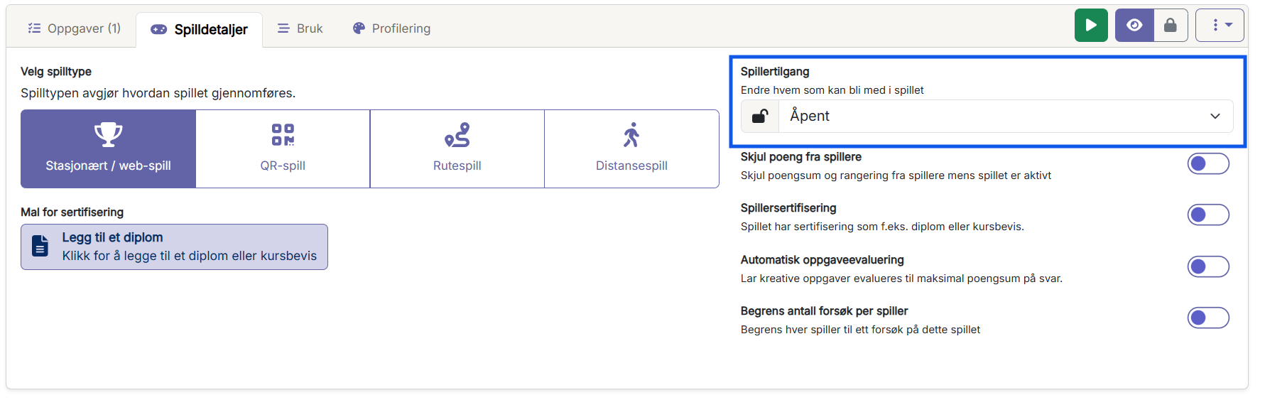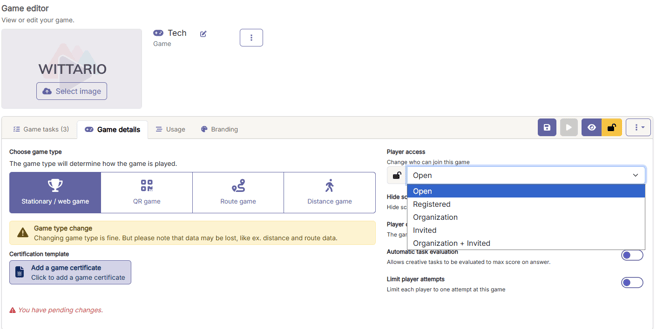 Can I set access to the game only for registered, members of the organization, invited, organization+invited.